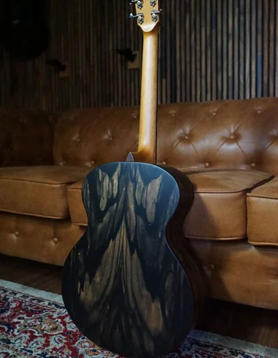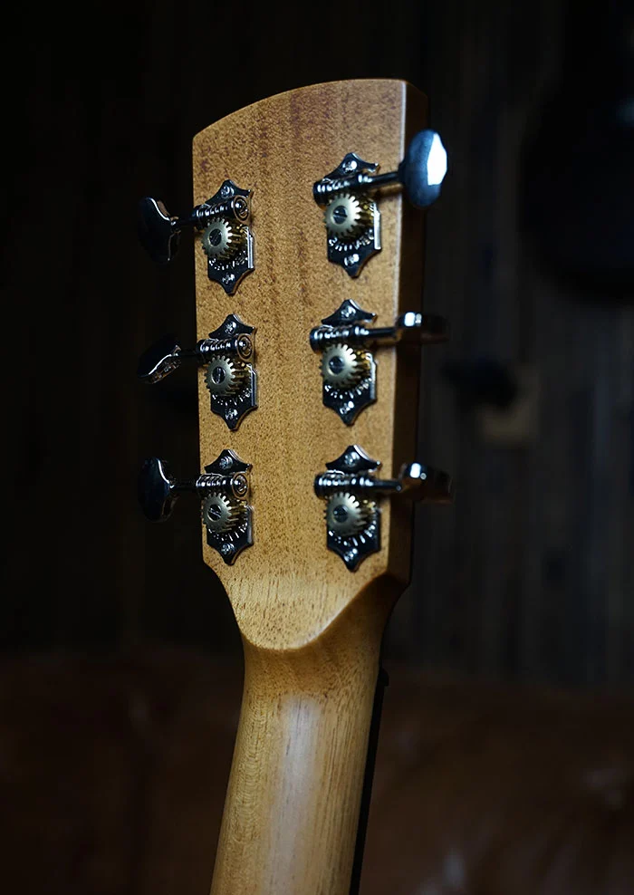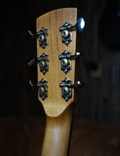 The back features a mirrored set of Crelicam Ebony resembling angel wings, framed by Indian Rosewood bindings. A twisted rope detail travels around the body and into the rosette, tying the visual design together. Ebony components, a one-piece Mahogany neck, and open-gear Grover machine heads maintain a balance between refinement and vintage character. A thin nitrocellulose satin finish allows the instrument to resonate naturally while feeling effortless in the hands.