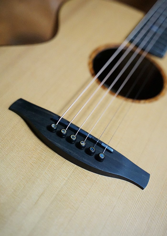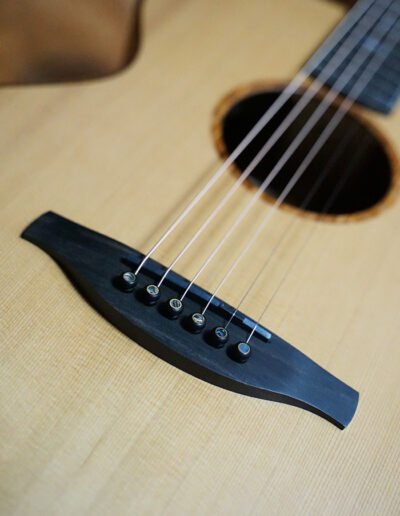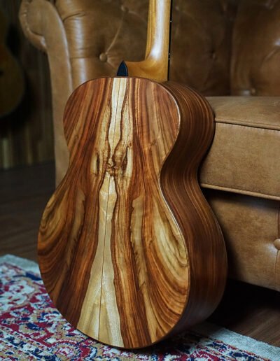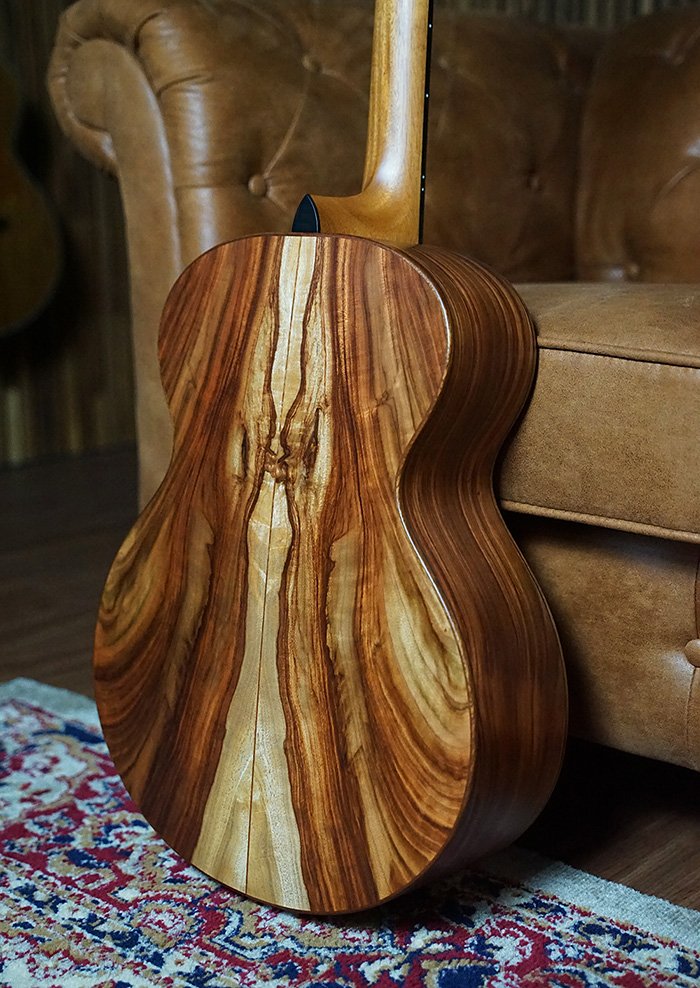 The second guitar begins with the same Old Growth Red Cedar soundboard, paired with highly figured Australian Camphor Laurel sourced from a very special, one-of-a-kind piece of timber. This rare Camphor Laurel not only offers stunning visual character with dramatic grain patterns but also contributes a warm, resonant, and highly responsive voice. Bracing has been individually refined, resulting in a lightweight guitar that sings freely across every register.