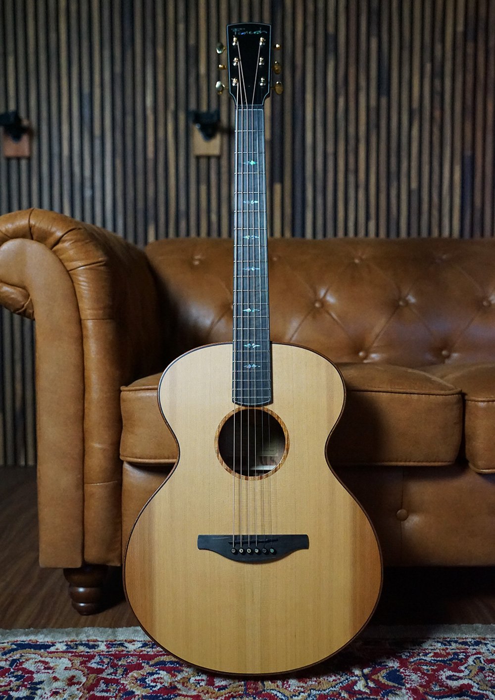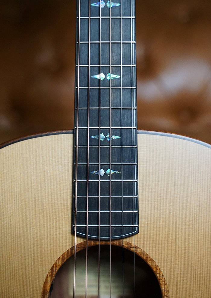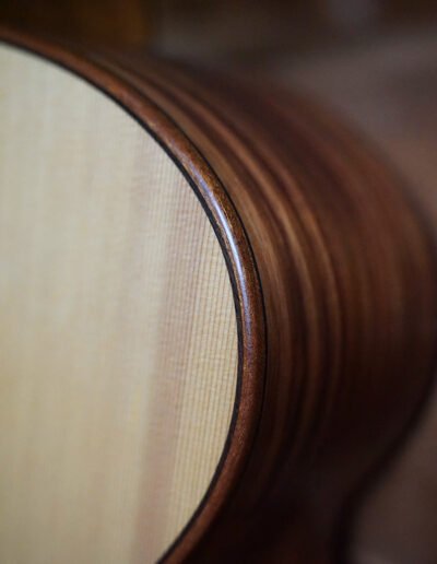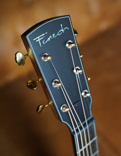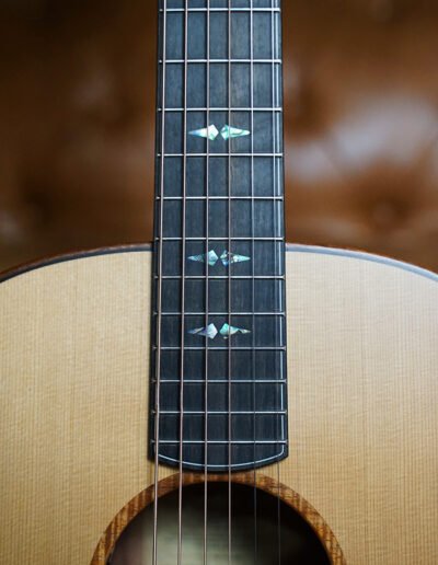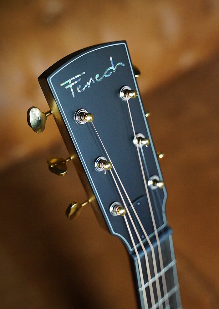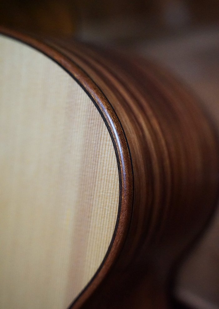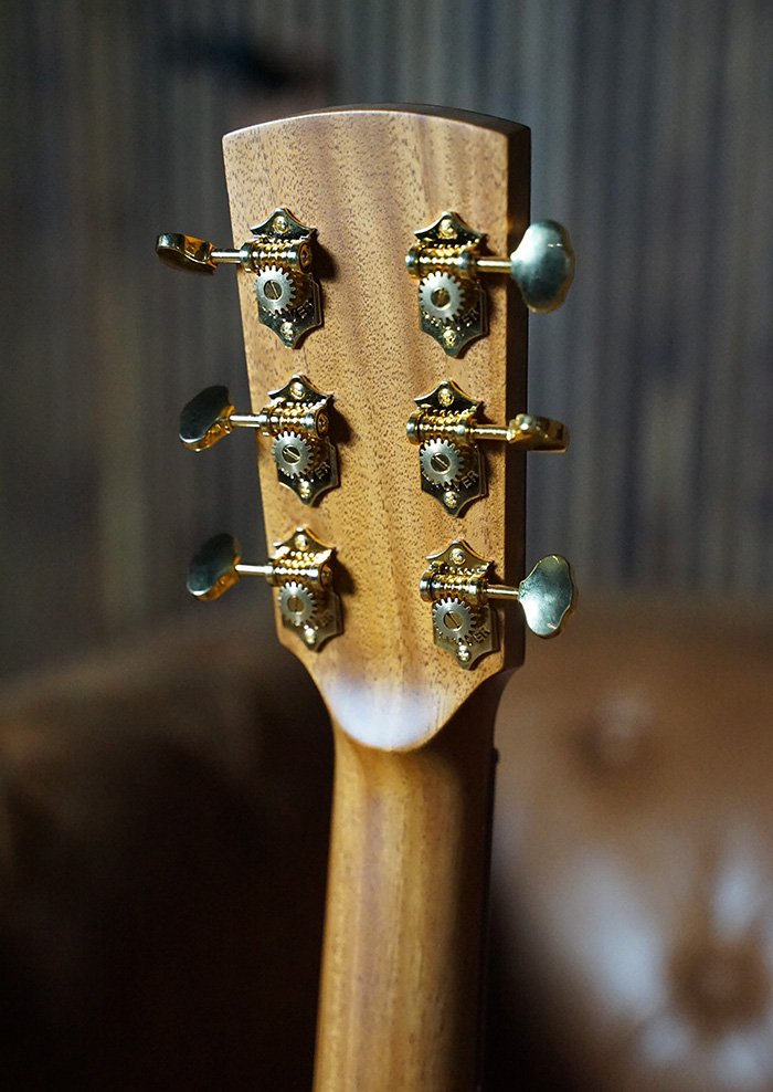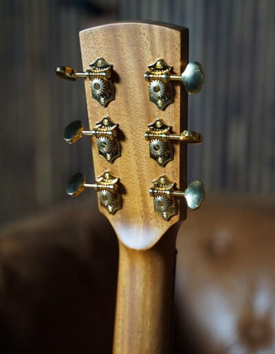 This guitar is adorned with Paua shell Tiger Tooth inlays, a Flamed Australian Blackwood rosette, and Mahogany bindings. A one-piece Mahogany neck is paired with gold open-gear Grover machine heads, offering precise tuning, minimal neck mass, and beautiful visual contrast. A thin nitrocellulose satin finish enhances touch and tone, while Ebony fingerboard, bridge, figured Ebony headplate, and purfling create a visually stunning and sonically refined instrument.