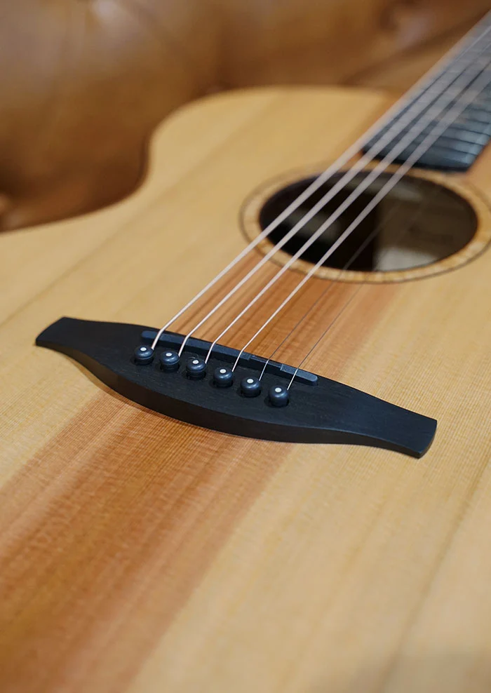 Mountain Ash is not commonly seen in acoustic guitar construction at this level. Traditionally reserved for larger structural applications, its use here reveals an unexpected tonal character, open, resonant, and expansive, with a natural clarity that pairs seamlessly with Cedar’s organic immediacy and bloom.