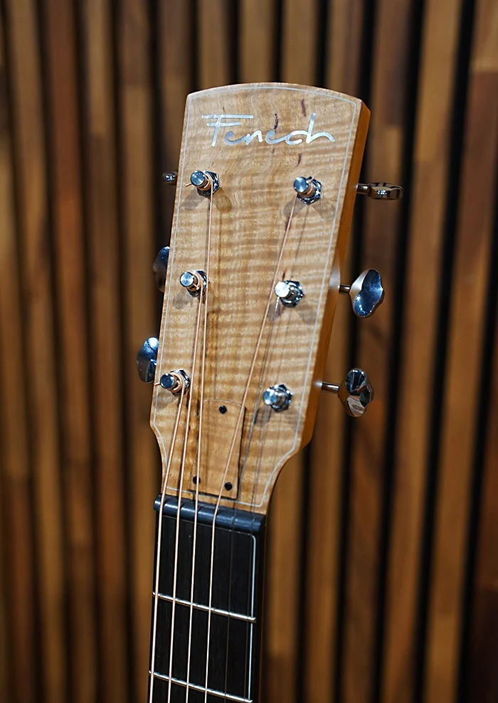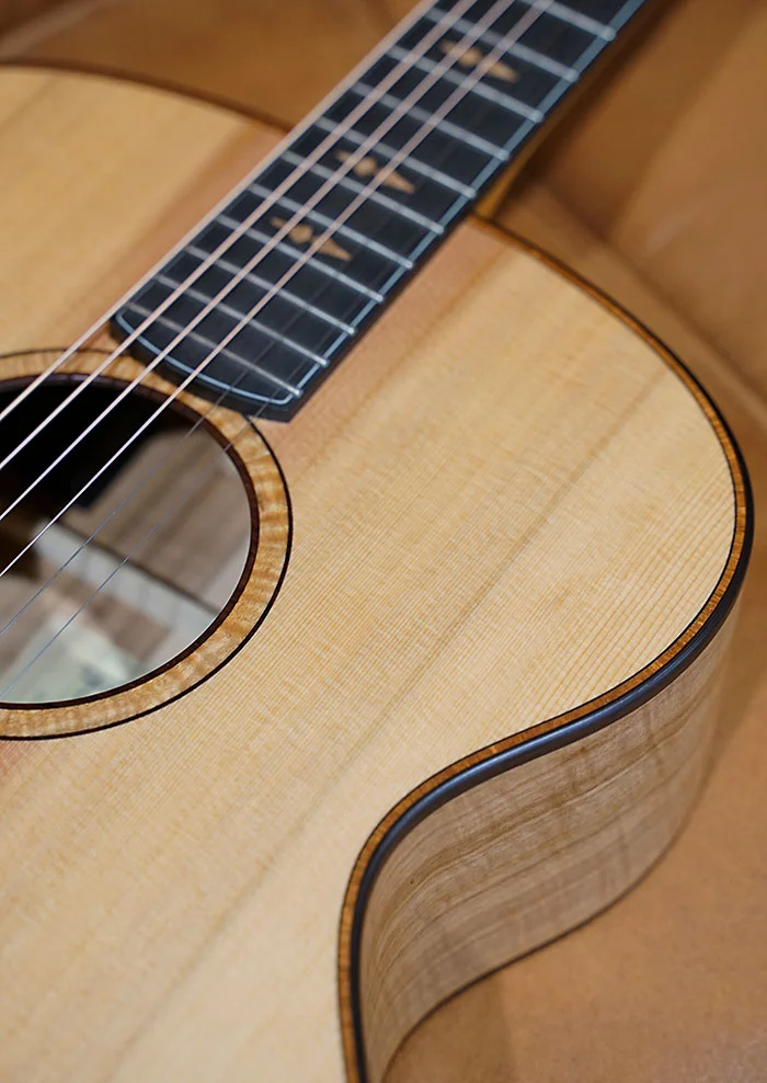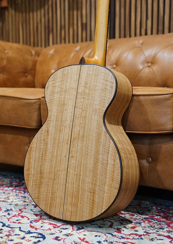 Built around a rare and often underutilised Australian Mountain Ash set, the back and sides reveal striking fiddleback figuring and natural colour streaking that gives the instrument a sense of movement even when still. Paired with an old growth Western Red Cedar soundboard, the result is a voice that responds with ease and speed, unfolding effortlessly under a light touch while retaining warmth and dimensional depth as it grows in intensity.