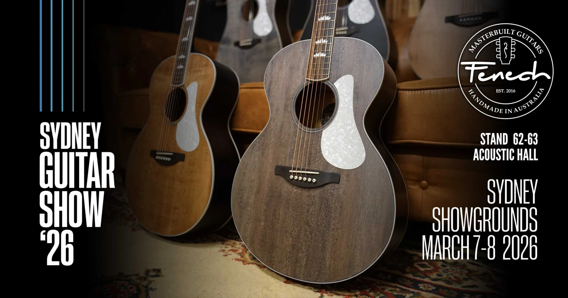Fenech Guitars is designing a show-stopping booth that promises visual impact and an intimate experience with some of Australia’s finest handmade guitars. Whether you are a professional musician, collector, or guitar enthusiast, the Fenech stand offers a rare opportunity to engage with craftsmanship, design, and tone like never before.